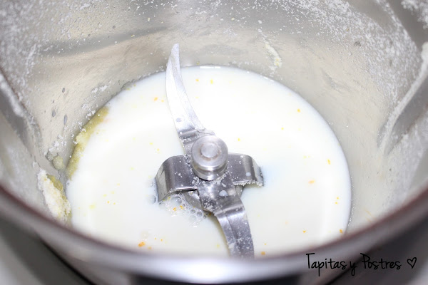 Trituramos con la picadora o batidora eléctrica el azúcar con las pieles de limón y naranja. Agregamos la leche que habremos calentado un poco, solo tibia, y mezclamos bien.