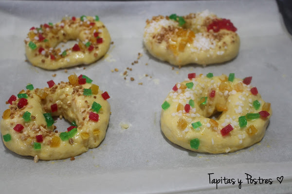 Colocar los ocho mini roscones separados entre si, en dos bandejas de horno con papel vegetal. Dejar reposar otra vez hasta que crezcan de nuevo. Si tenemos prisa, podemos hacer lo siguiente: encender el horno a 50º, apagar y dejar dentro las bandejas con los mini roscones.