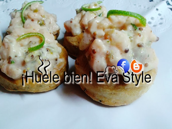 4.-Repartimos el tartar de salmón sobre los scones, adornamos con las tiras finas de la piel de 1 lima.