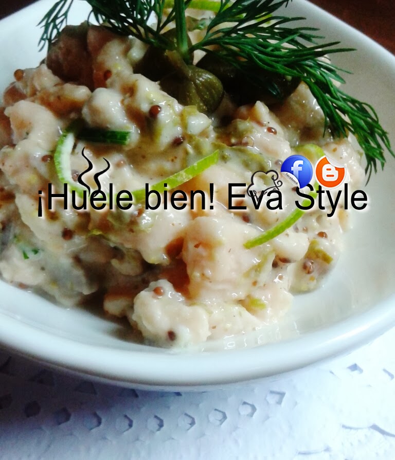 3.- A continuación escurrimos el jugo. Preparamos la salsa; en un bol ponemos la mostaza, la mahonesa, el eneldo picado, las alcaparras y el tabasco. Lo mezclamos todo con una varilla. Añadimos el salmón y mezclamos bien con el resto de los ingredientes.