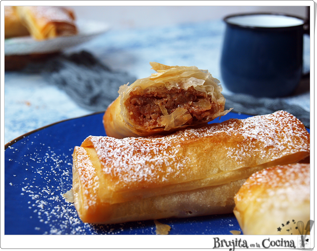 Estos ministrudel es una versión el postre alemán, ya que he usado pasta filo que le da un crujiente muy interesante sin tener que hacer la masa, que esas cosas son mas complicadas. Pero el relleno de manzana y canela es tan tan ricoooo.