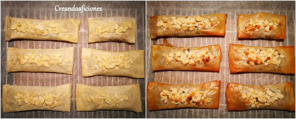 Pincelamos con un poco de mantequilla por encima los mini strudel y ponemos unas almendras laminadas.
