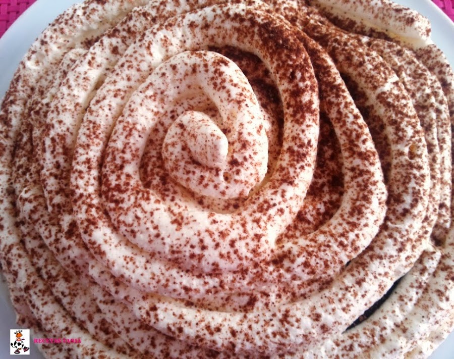 Trituramos las galletas y añadimos el café y la leche tibia,mezclamos todo bien hasta que se quede bien mezclado,lo ponemos de base en un molde redondo no muy grande. Encima ponemos nata montada (crema de leche) con el azúcar glass y encima el