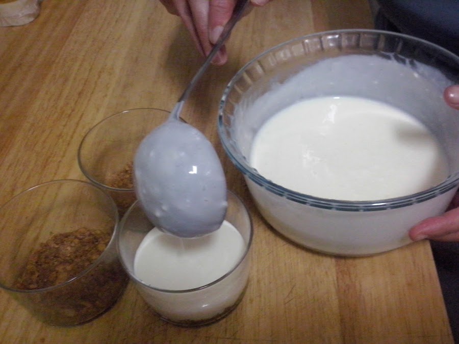 Sacamos nuestros vasitos del frigorífico y rellenamos con cuidado. Recomiendo no llenarlos demasiado porque el aporte calórico de la propuesta de hoy es bastante alto.