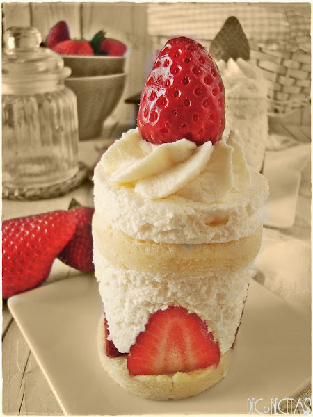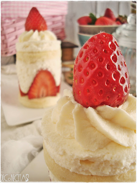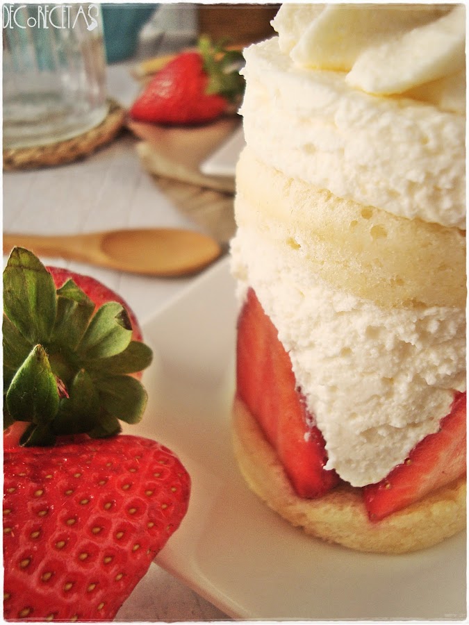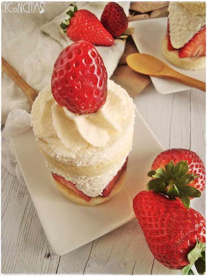 Colocamos nuestros aros de emplatar con papel de acetato por las paredes interiores. En el fondo colocamos nuestra plancha de bizcocho, regamos ligeramente con almíbar y colocamos nuestras fresas en la posición indicada. Rellenamos con nuestra crema, volvemos a tapar con otro bizcocho qué regamos de igual forma y culminamos con más crema y una fresa