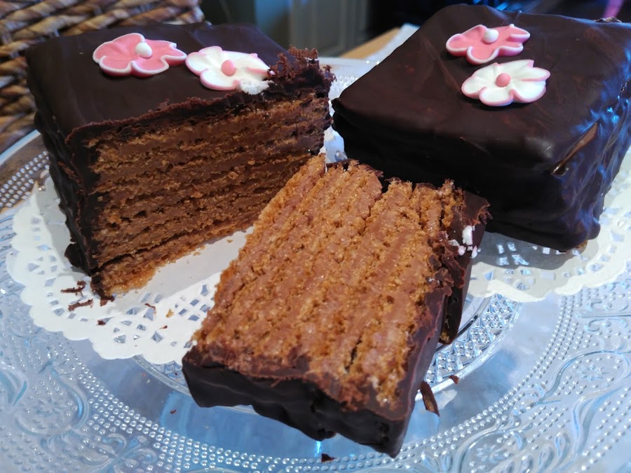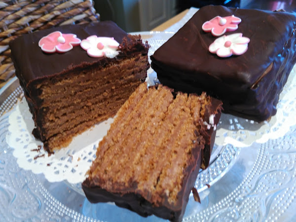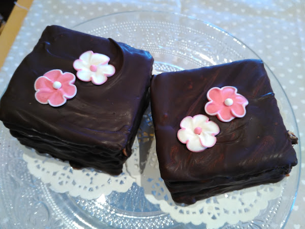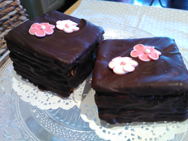 - Cuando tengamos la altura deseada, cubrimos con el chocolate de cobertura deshecho, repartiendo bien por todos los costados y adornamos a nuestro gusto.