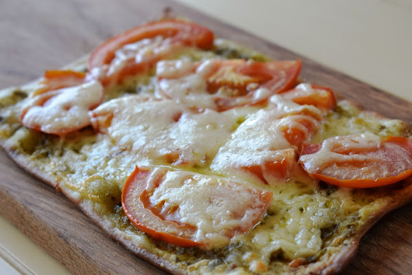 Añadimos el pesto como base y el queso rallado. Horneamos durante 15-20 minutos o hasta que la masa este dorada y el queso fundido.