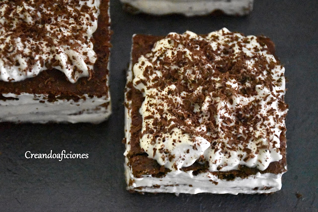 Ponemos un trozo de bizcocho y rellenamos de nata (crema de leche), otro bizcocho y rellenamos de nata (crema de leche), podéis hacer dos o tres trozos de bizcochos para montar las mini tartas y untamos nata (crema de leche) en los bordes y la alisamos con una espátula de plástico o con un cuchillo, al final decoramos con más nata (crema de leche) y con el chocolate rallado.
