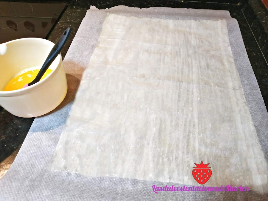 Cogemos la masa filo y la vamos separando por laminas. A continuación, la pintamos con la mantequilla derretida.