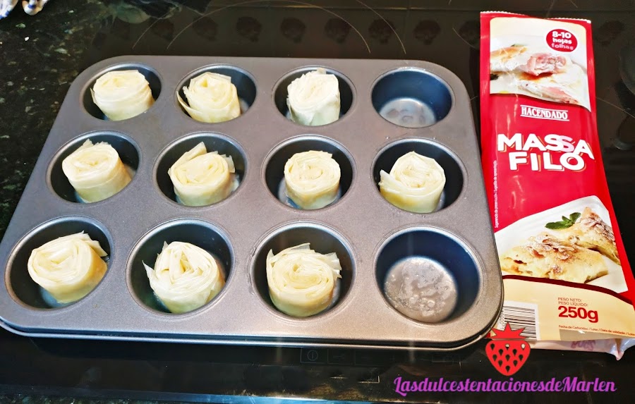 Una vez que este totalmente plegada, la vamos enrollando en forma de flor, y las metemos en los moldes. Repetimos la misma operación con las demás laminas.