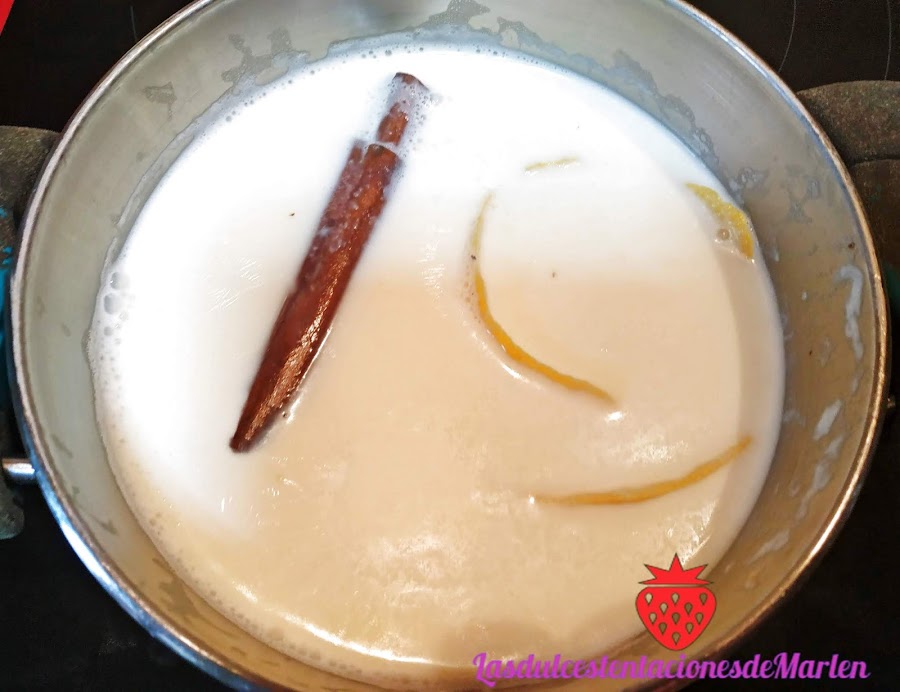 Mientras tanto vamos haciendo la crema de natillas. Ponemos en un cazo la leche, la nata (crema de leche), piel de limón y canela en rama. La ponemos a fuego alto hasta que empiece a hervir, la apartamos y la dejamos reposar un par de minutos.