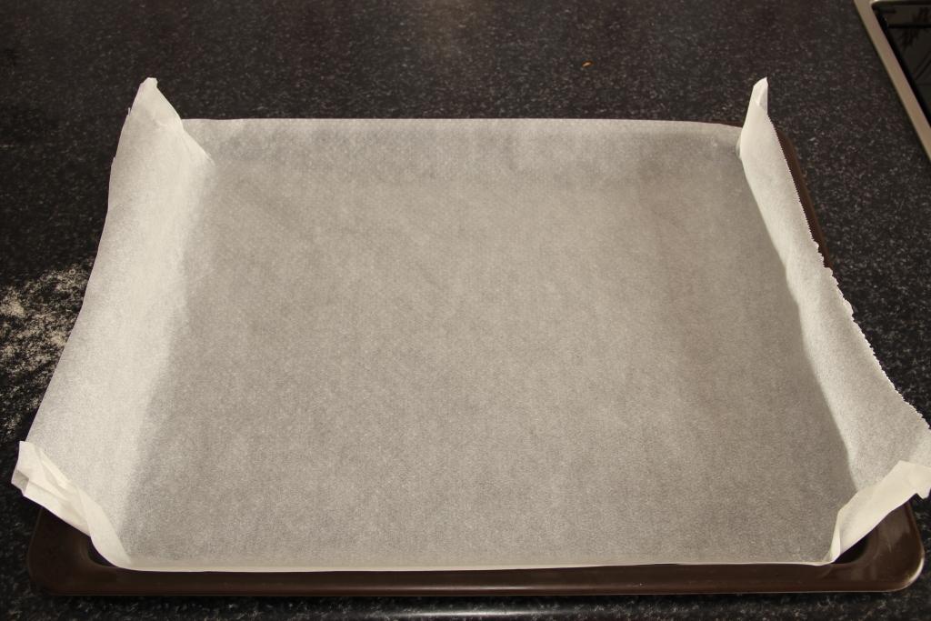 Forramos una bandeja de horno con papel de hornear del que doblamos los bordes hacia arriba, haciendo unos pliegues en las esquinas. Reservamos.