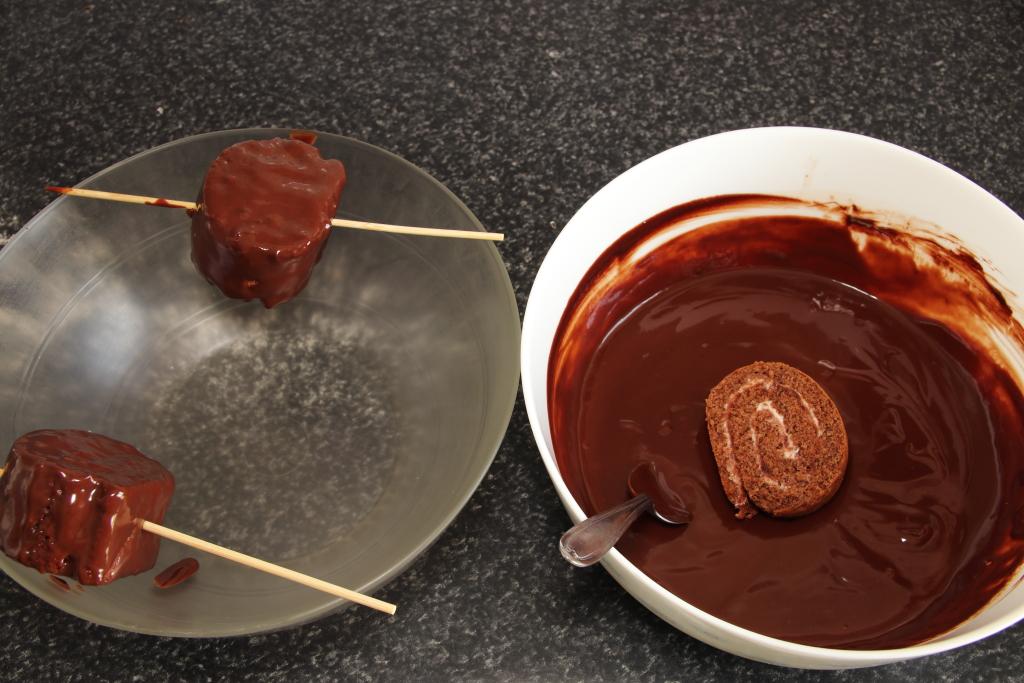 Sacamos los tigretones del papel. Para cubrirlos con la capa de chocolate, los he metido uno a uno en la mezcla del chocolate, los he rebozado procurando que no queden zonas sin cubrir, los he ensartado en un palo de brocheta (con cuidado de que no se rompan) y los he dejado escurrir sobre un bol amplio (o dos dependiendo de los tigretones que salgan). El chocolate sobrante lo he guardado para próximos usos.