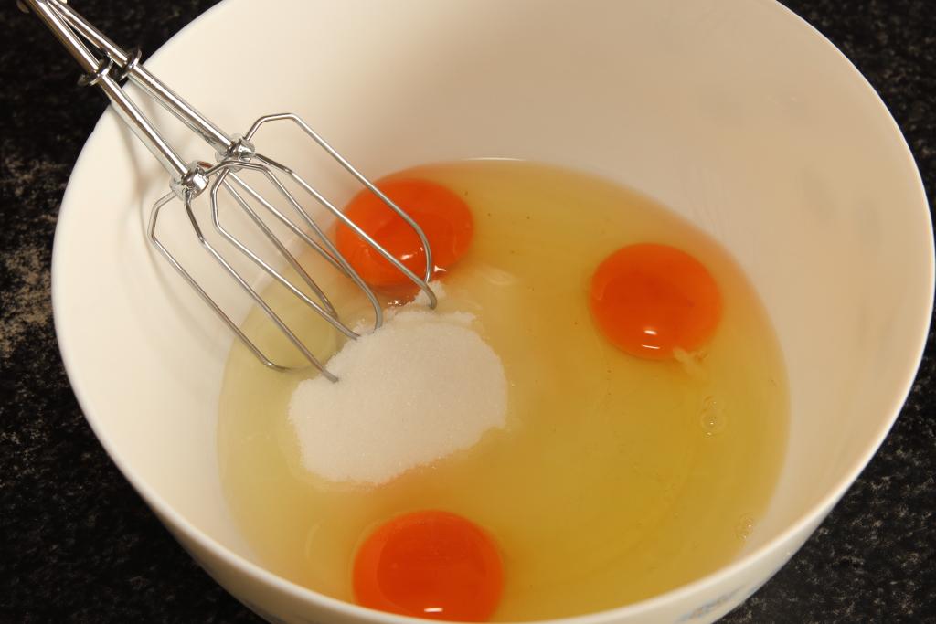 En un bol amplio ponemos los huevos con el azúcar, batimos con las varillas eléctricas, hasta que la mezcla esponje y blanquee. Agregamos la harina tamizada, mezclamos con delicadeza y movimientos envolventes hasta que quede todo bien integrado.