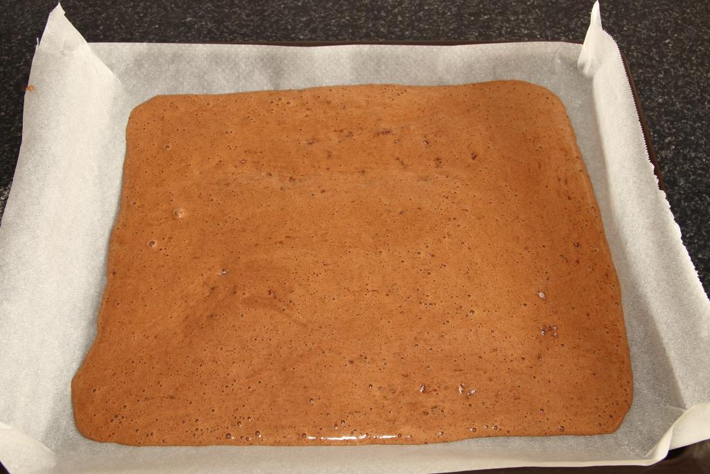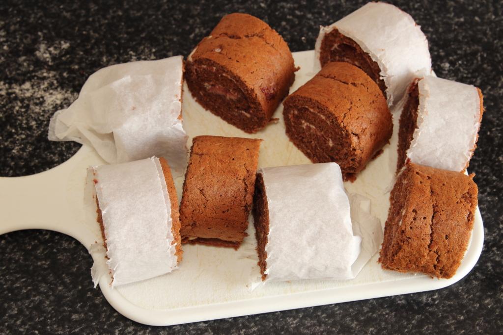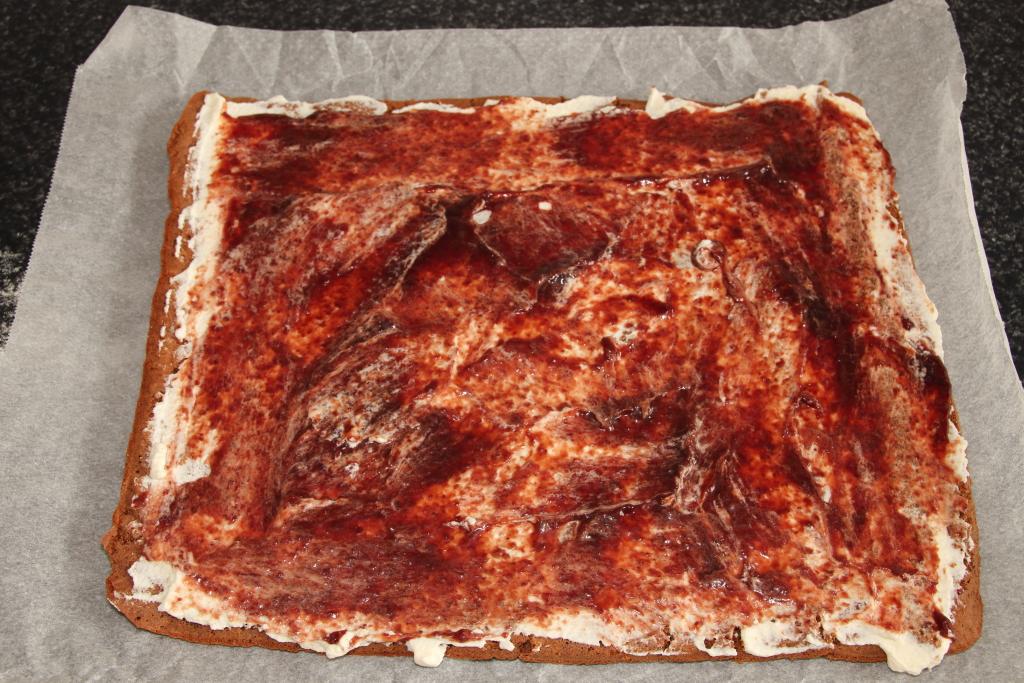 Desenrollamos el bizcocho, untamos una capa de nata montada (crema de leche) y encima una fina de mermelada, sin llegar a los bordes del bizcocho, enrollamos de nuevo en el papel, de forma que quede sólo por el exterior, como si fuera un calamelo, y cortamos los tigretones del tamaño deseado, con papel incluído.
