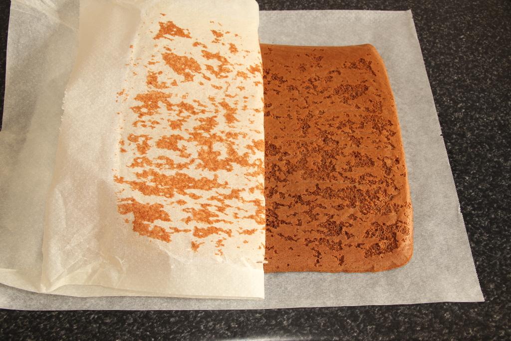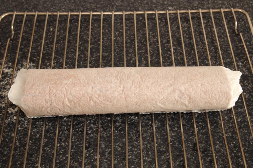 Sacamos del horno, volteamos la plancha de bizcocho sobre otro papel de horno, retiramos con cuidado el papel de cocción y enrollamos el bizcocho (debe estar bien caliente para evitar que se rompa) sobre sí mismo a lo largo, ayudándonos con el papel de abajo. Pasamos el cilindro a una rejilla y dejamos enfriar por completo.