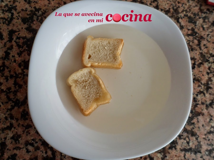 Comenzaremos diluyendo en un plato 2 vasos de vino blanco y 1 de agua y remojando todas las rebanadas en él. Debemos mojarlas pero no empaparlas, ya que sino se pondrían demasiado blanditas. Una vez que las vayamos mojando, las iremos reservando en una fuente.