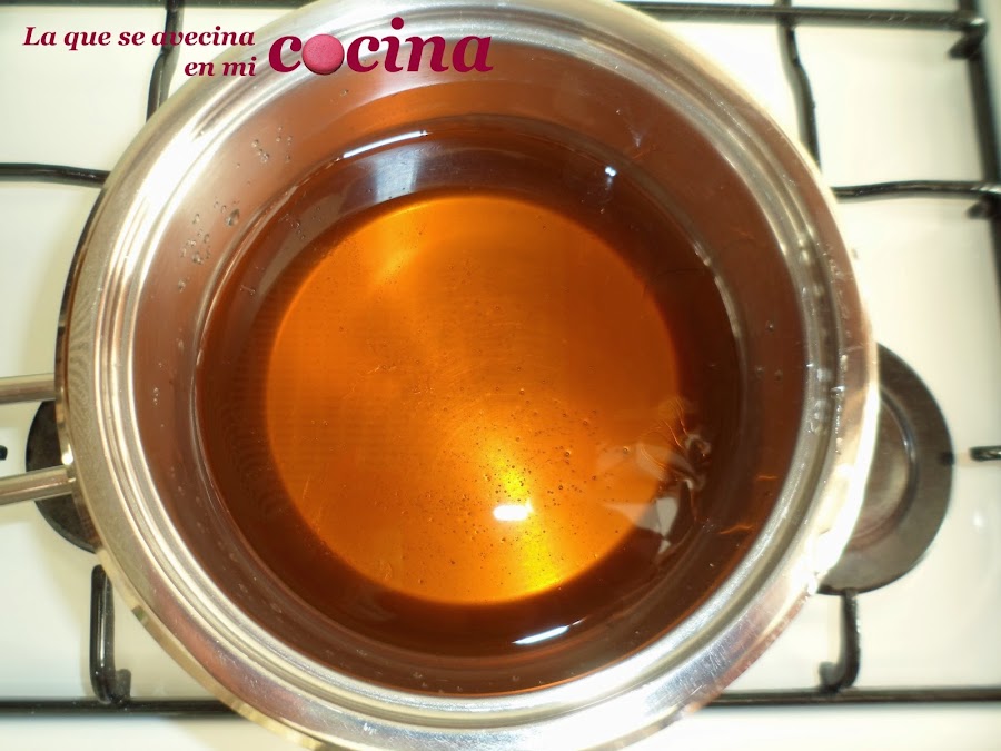 A continuación pondremos en un cazo el kilo de miel y 6 cucharadas soperas de agua. Lo removemos un poco con una cucharada y lo ponemos a fuego bajo. Esto lo hacemos para diluir la miel un poco y que no esté tan densa. Tenemos que conseguir como un almíbar suave, no algo denso y pesado. Aprovecharemos también para poner a calentar nuestro aceite de girasol en un perol.