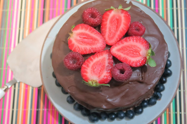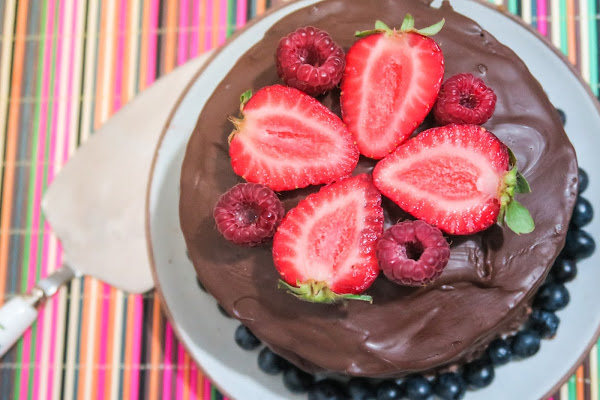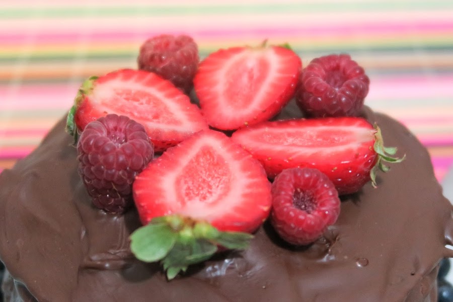 Decorar con frutas (yo usé 2 frutillas/fresas en mitades y 4 frambuesas) y llevar al refrigerador para que endurezca. También puse arándanos en las orillas de la superficie de la torta.