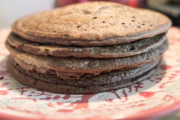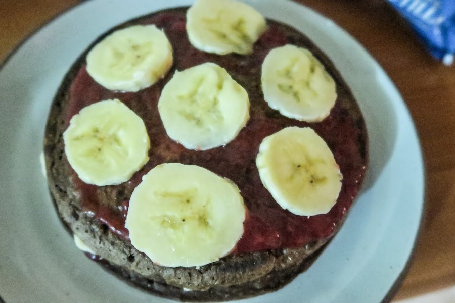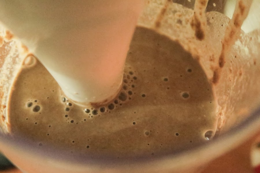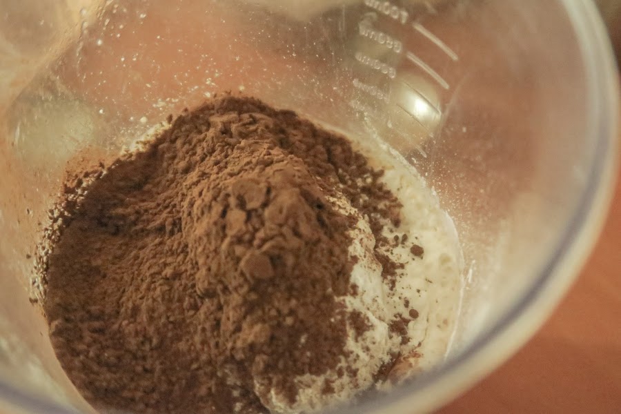 En una minipimer, agregar todos los ingredientes para los panqueques (harina, leche de almendras, polvos de hornear, cacao, vainilla, jengibre, stevia) y mezclar hasta que quede todo unido.