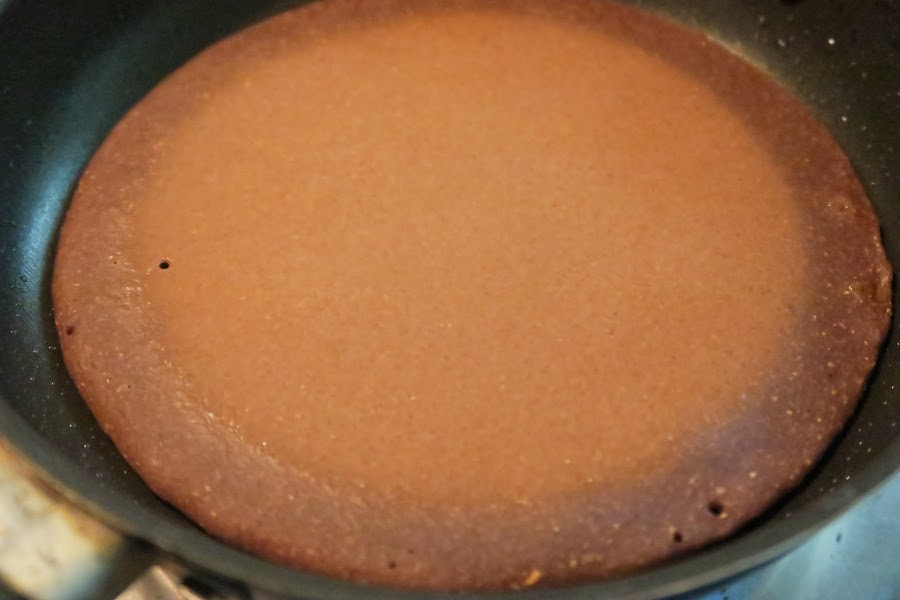 Luego, precalentar una sartén de teflón pequeña y añadir la mezcla de a poco. Son aproximadamente 3 cucharadas de la masa para 1 panqueque. Cocinar bien por ambos lados, evitando que se doren mucho.