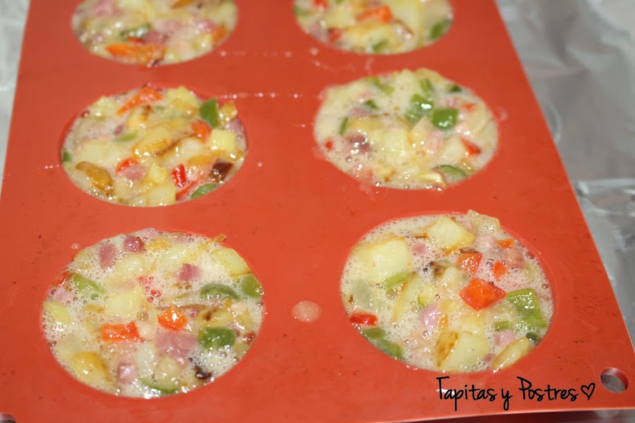 Ponemos una cucharada colmada de la fritada en cada hueco del molde y horneamos. Unos ocho minutos y luego damos la vuelta. Como las mini tortillas ya estarán cuajadas no nos costará trabajo darles la vuelta. Solo las dejaremos cinco minutos para que se doren un poco.