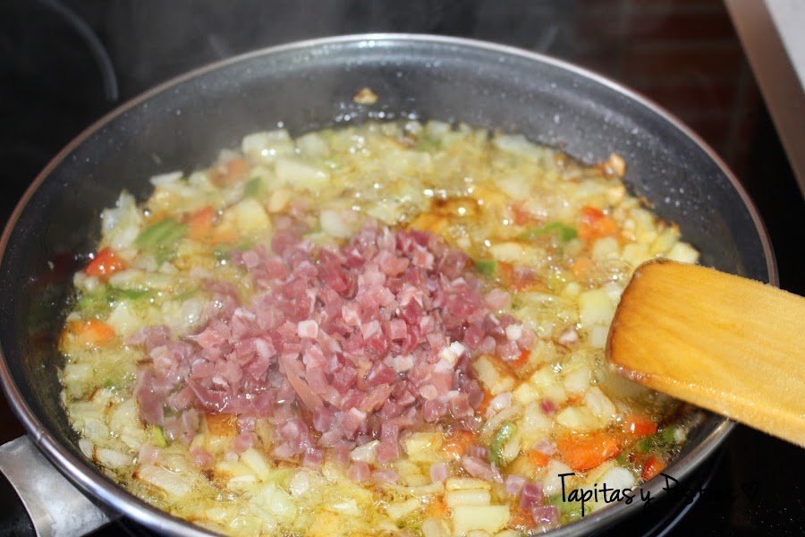 Yo he tuneado la receta porque no tenía guisantes que forman parte de la receta original y he puesto taquitos de jamón en lugar de chorizo.