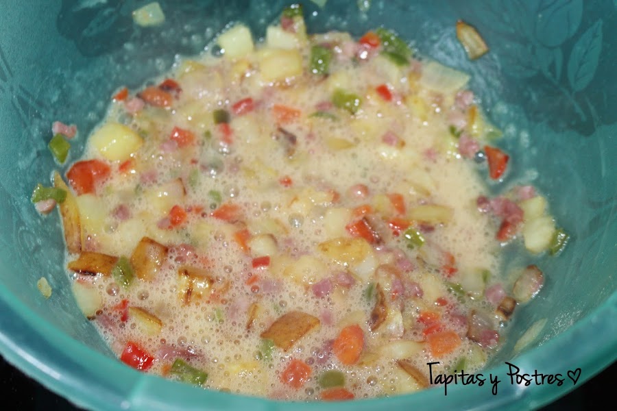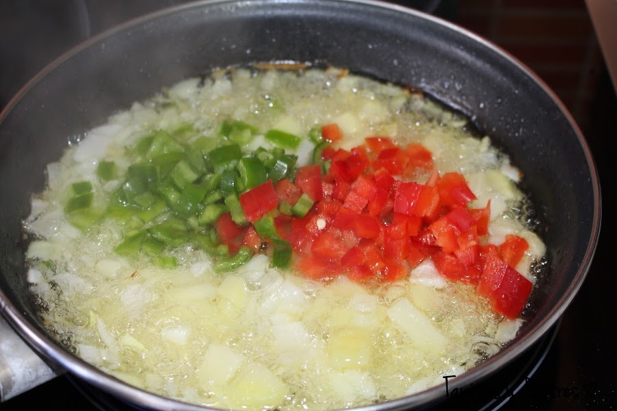 Ponemos a calentar el aceite en una sartén grande y freímos en él la patata y la cebolla cortadas a cuadraditos. Dejamos que se hagan un par de minutos y añadimos los dos pimientos a cuadraditos. Dejamos que se vayan haciendo y cuando estén casi hecho añadimos los taquitos de jamón.