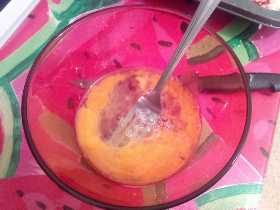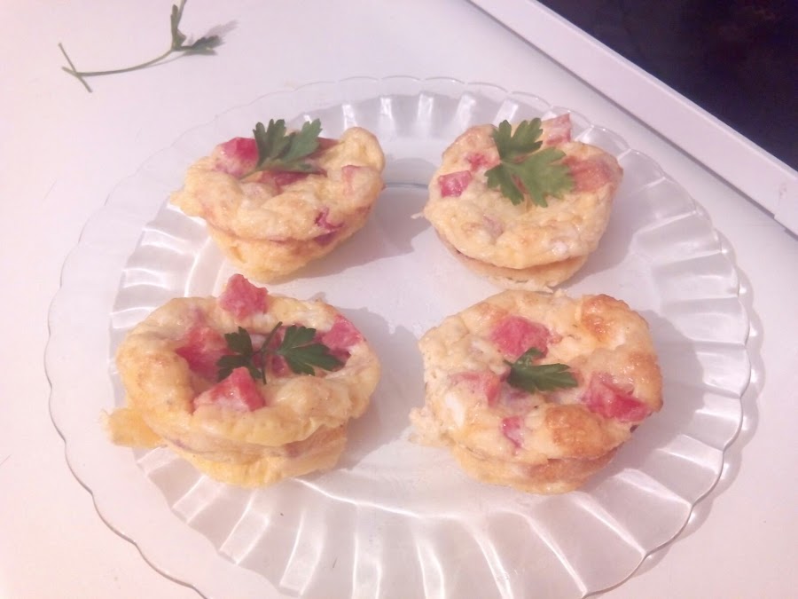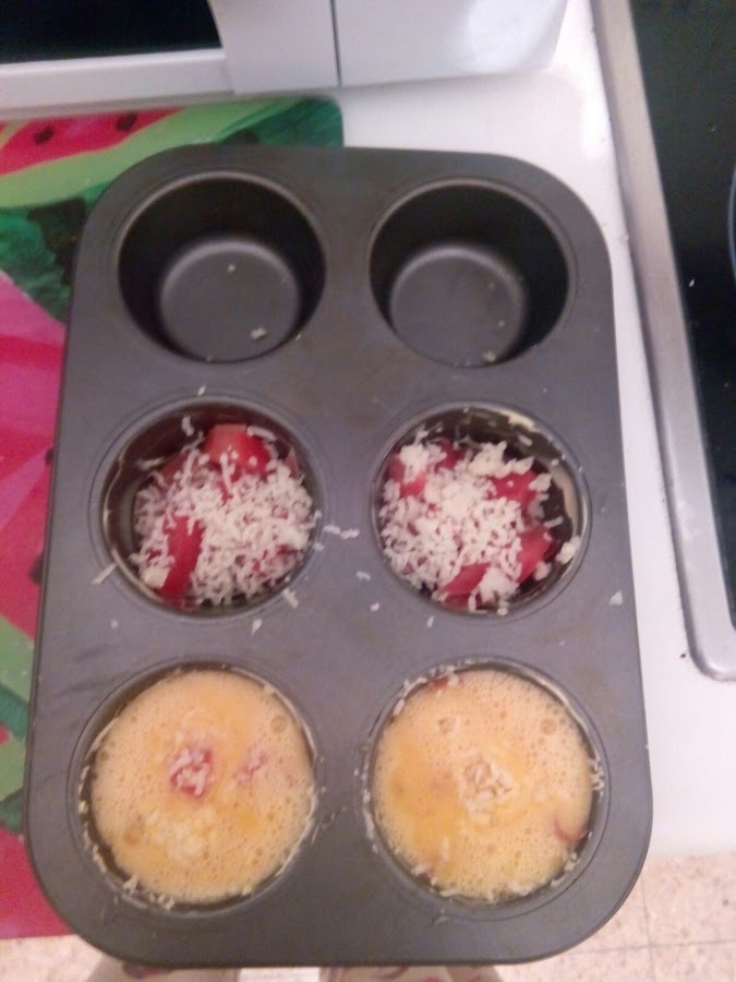Batimos los huevos con la sal y la pimienta y los vertimos en los moldes. Metemos al horno durante 15 minutos a 200º. Dejamos enfriar y a comer.