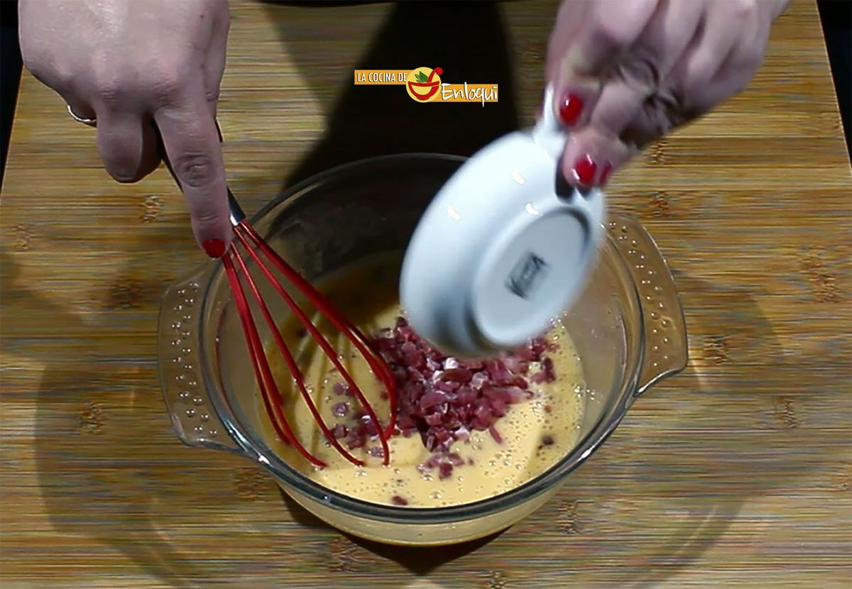 Pon en un bol los huevos y comienza a batir. A continuación añade la sal, la pimienta, el pimentón y sigue batiendo. Por último añade la leche. Cuando todo quede bien integrado y la mezcla esté aireada y espumosa añade los tacos de jamón y termina de mover. Reserva.