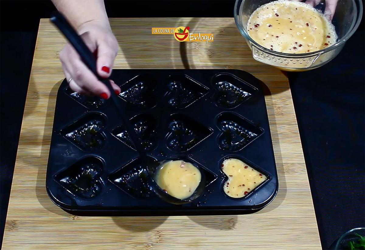 Con la ayuda de un cazo vamos a verter la mezcla que tenemos reservada en los moldes y llevamos al horno durante 15-20 minutos o hasta que el huevo quede bien cuajado.