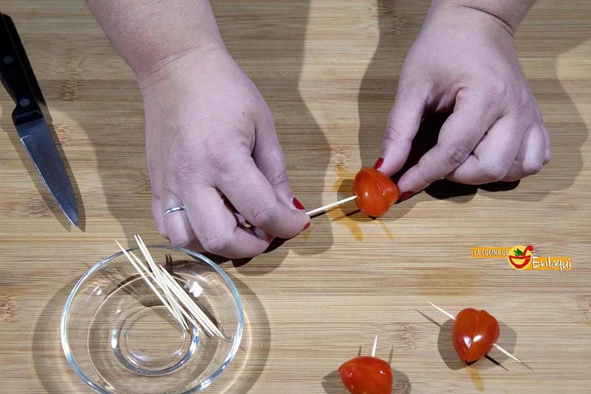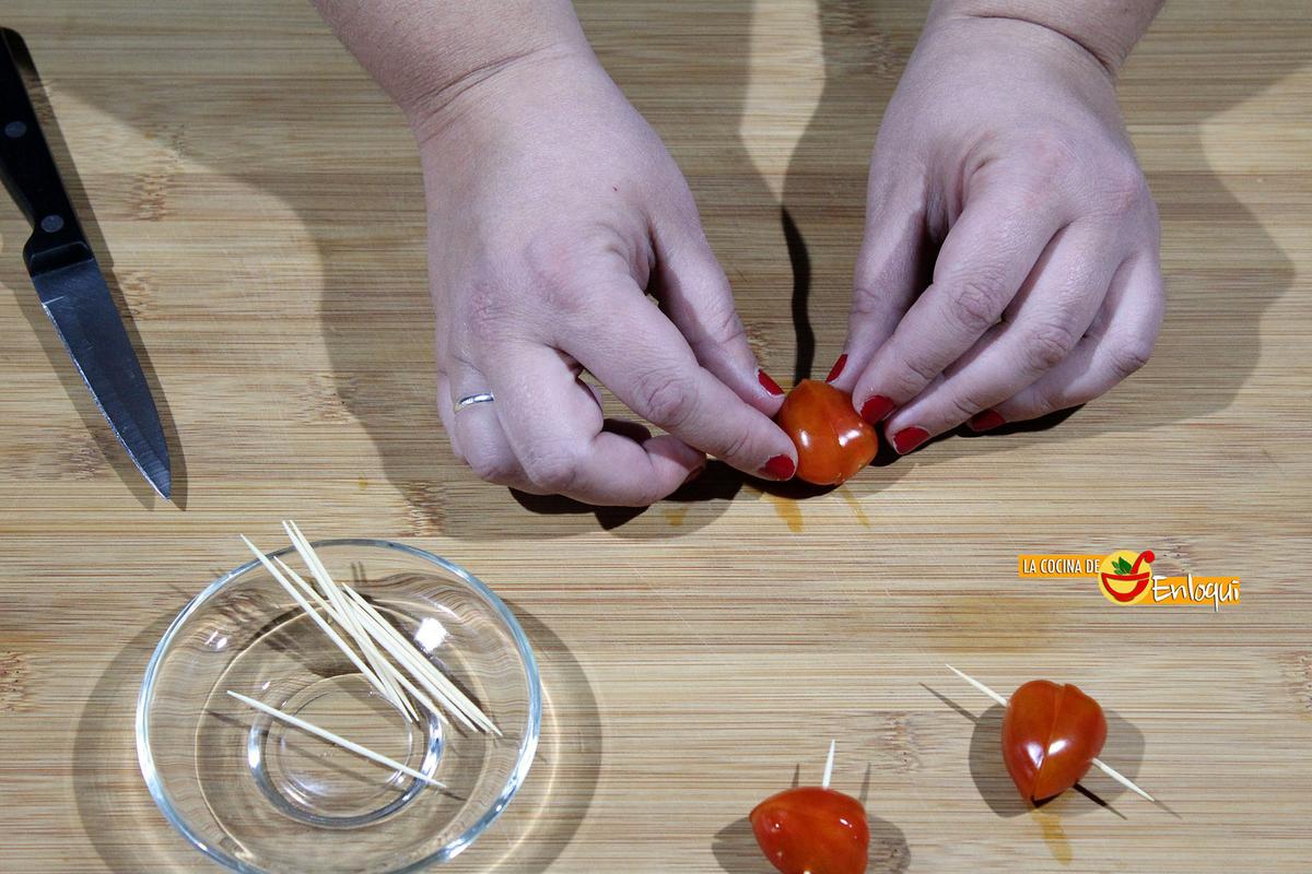 Mientras que se hornea preparamos la decoración con los tomates cherry, haciendo un corte transversal, tal y como puedes ver en el vídeo. Gira una de las mitades y, con la ayuda de un palillo, une las dos mitades con forma de corazón.