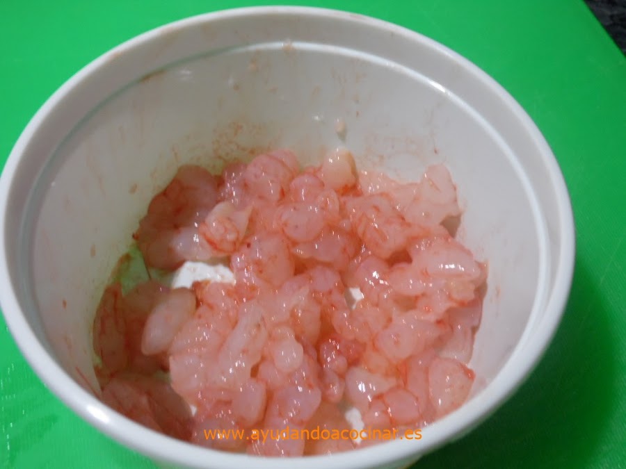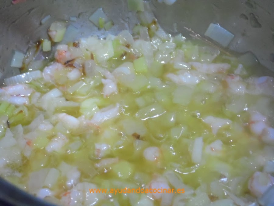 Una vez rehogado puerro y cebolla incorporar las gambas cortadas en trozos pequeños
