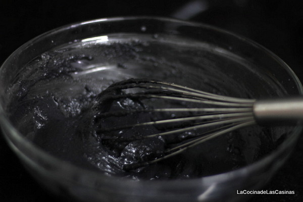 Mientras tanto prepara el parmentier. No te digo cantidades, dependerá del número de personas a las que prepares este rico aperitivo. Sigue las instrucciones del fabricante del puré de patatas. Como ves en los ingredientes, he puesto 3 partes de leche por una de caldo de cocer el pulpo que has colado y pasado por una tela o un colador de tela para retirar las impurezas. En un bol, disuelves la tinta con un poco de aceite, vierte sobre el puré, espolvorea de pimienta y rectifica de sal, ten en cuenta que la tinta es salada. Bate con las varillas hasta que esté totalmente incorporado.