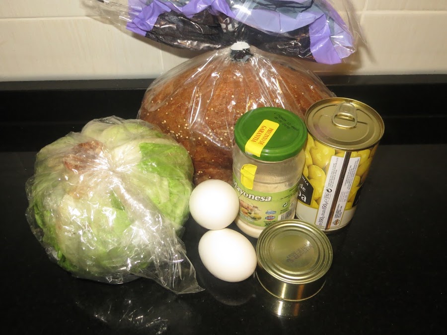Mezclamos el atún escurrido con la mayonesa. Abrimos el pan y ponemos encima la lechuga o la rúcula, encima añadimos la mezcla del atún y la mayonesa, el medio huevo y decoramos con las aceitunas y ya está listo para comer.