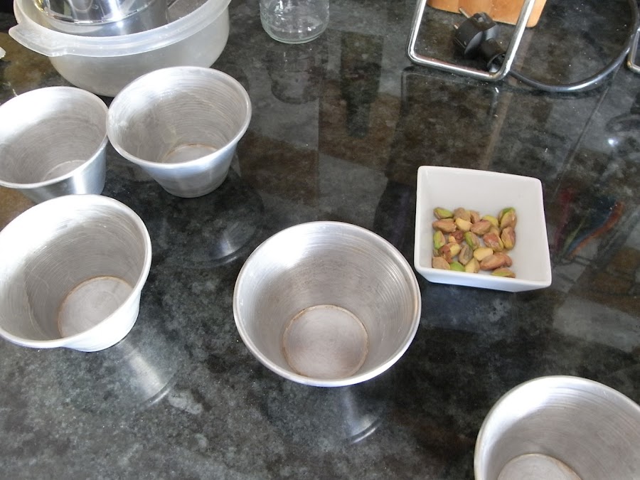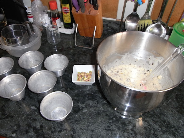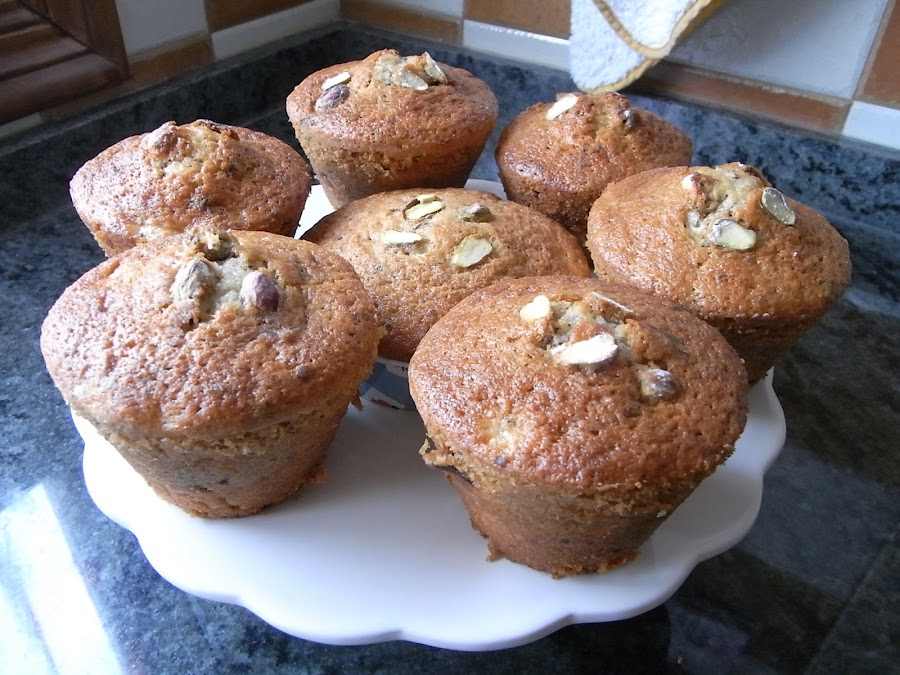 Rellenamos los moldes (como me sobraba masa busqué moldes de muffins e incluso unos nuevos que compré para tartaletas y los rellené) y puse por encima los pistachos que había guardado y los llevé al horno 20-25 minutos dependiendo del tamaño.