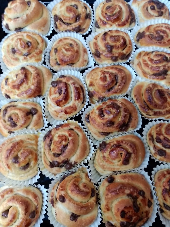 5.- Espolvorea con azucar moreno sobre la mantequilla y esparce las pepitas de chocolate. Enrolla como si fuera un brazo de gitano de forma que el borde sin mantequilla qude al final. Pincela el bord con agua y sella. Nos ha quedado un rulo.