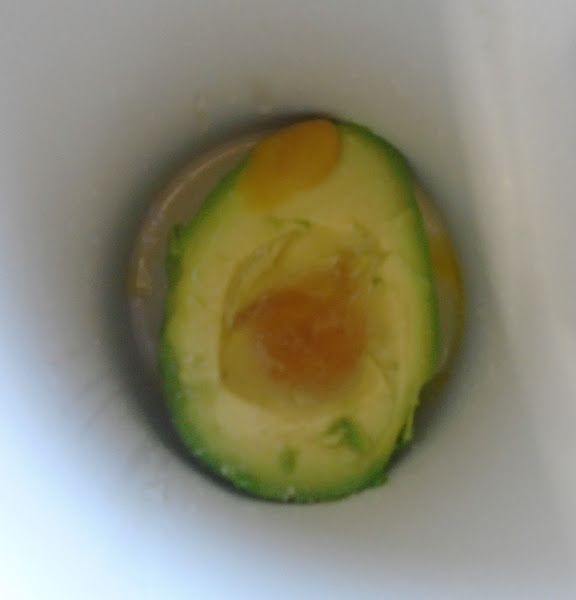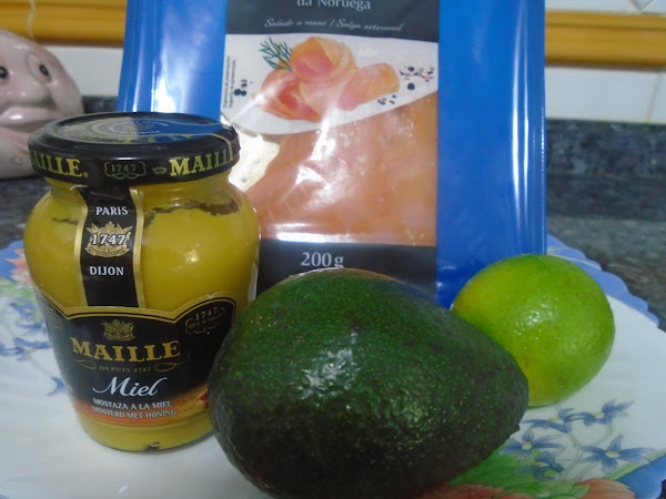 Pelamos el aguacate y lo colocamos en el vaso de la batidora. Añadimos la miel. un poco de aceite de oliva, el zumo de media lima, media cucharadita de las de café de mostaza a la miel, sal y lo trituramos. Reservamos el cremoso de aguacate en una manga pastelera.