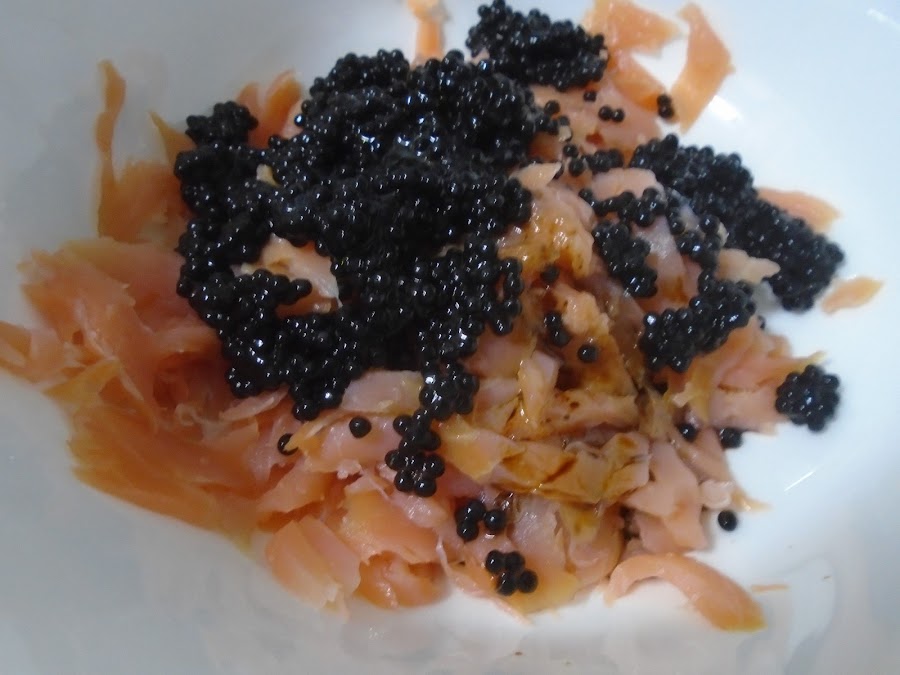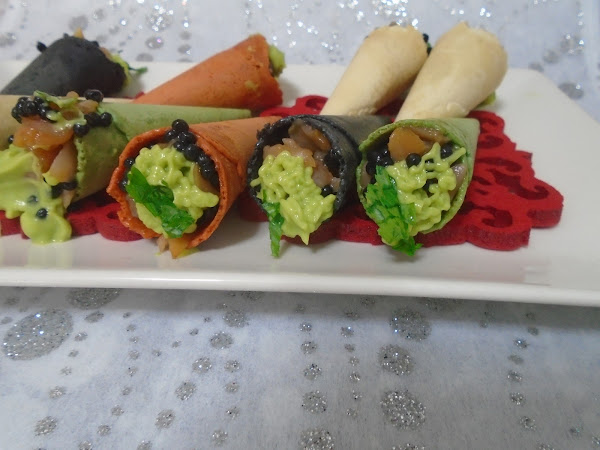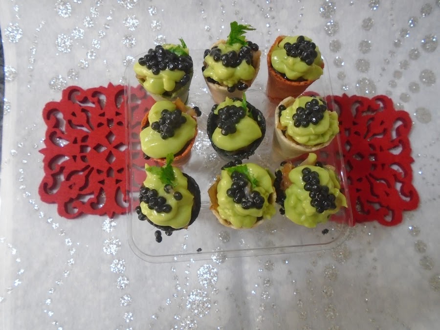 En un bol, mezclamos el salmón troceado con el sucedáneo de caviar, aceite de oliva y salsa de soja, al gusto. Rellenamos los conos con el tartar. Sobre el, disponemos el cremoso de aguacate.