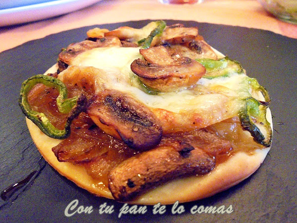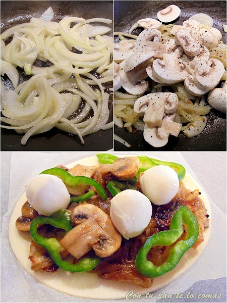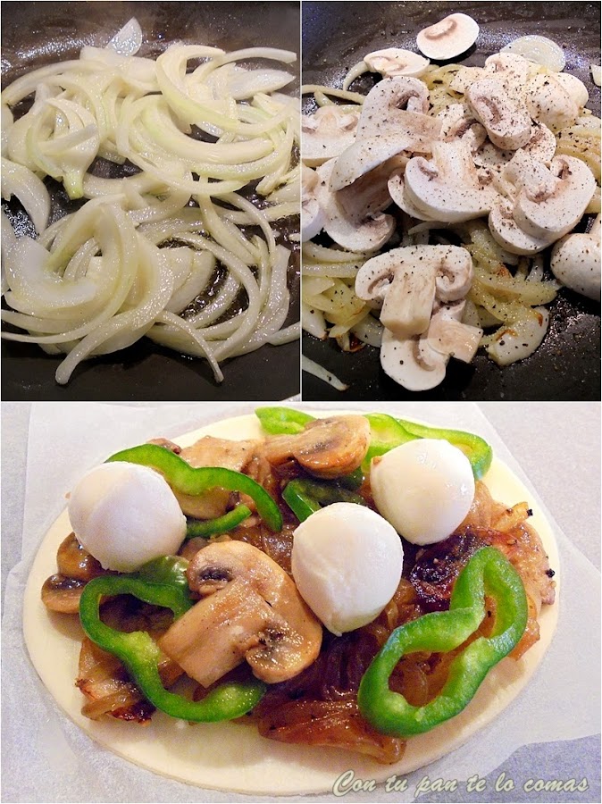 En este caso estas pizzitas eran para mi vegetariano, así que le puse cebolla, champiñones y pimiento verde.