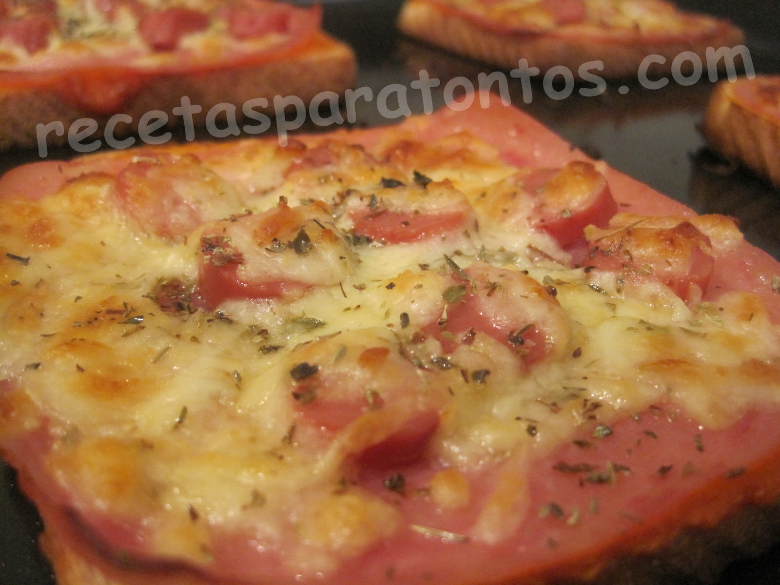 Echamos en cada rebanada, por este orden: tomate frito (no pasarse para que no se ablande el pan), jamón york, salchichas, mozzarella y orégano.