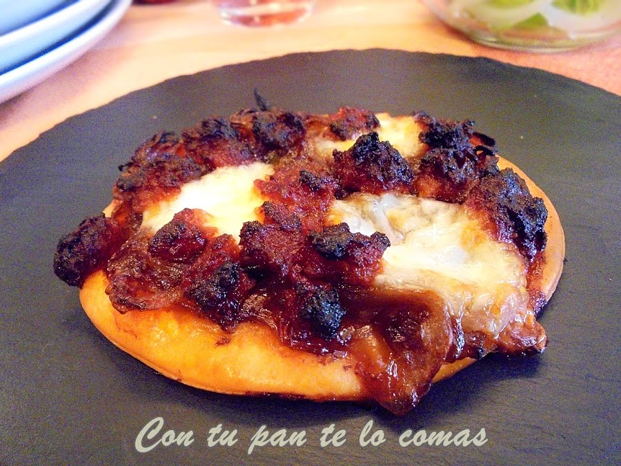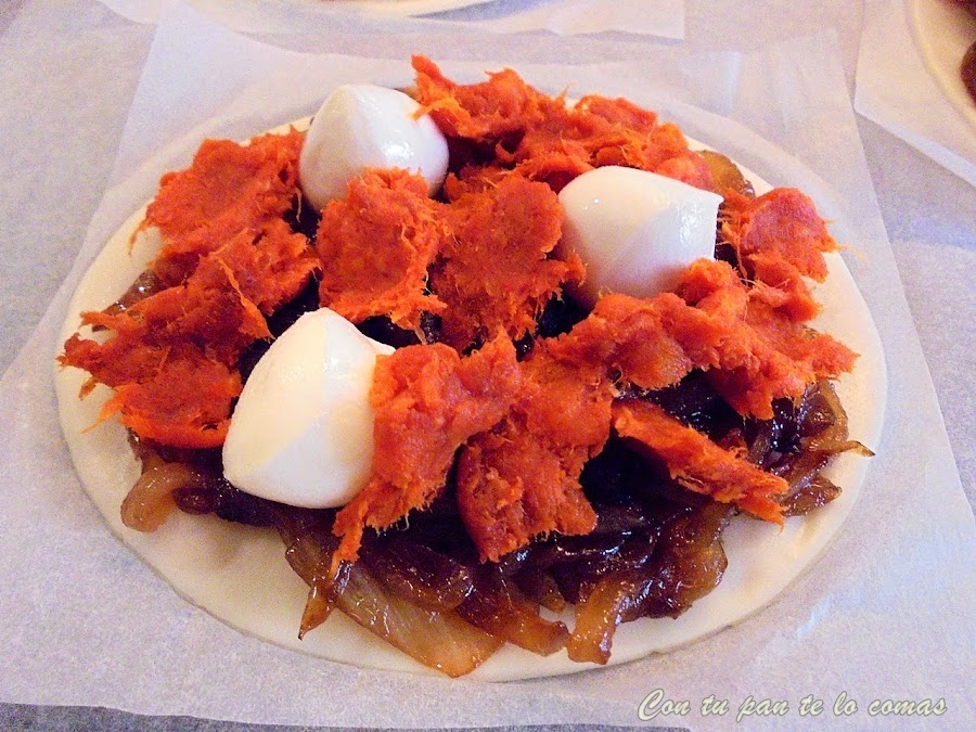 Para el aperitivo de hoy pensaba hacer una tosta con sobrasada pero mientras estaba en el súper vi estas minipizzas y pensé que quedarían estupendas con lo que tenía pensado: cebolla caramelizada, unas perlas de mozzarella y por supuesto una buena sobrasada, porque esta combinación de ingredientes me encanta y estas masas son finitas y quedan muy crujientes.