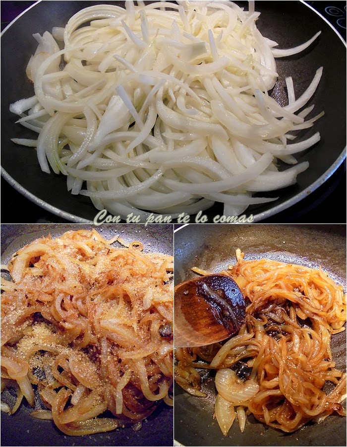 1. Para hacer la cebolla caramelizada cortamos en pluma toda la cebolla y la sofreímos lentamente en una sartén con un poco de aceite de oliva, hasta que coja un colorcito tostado.