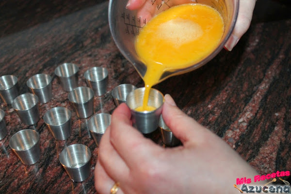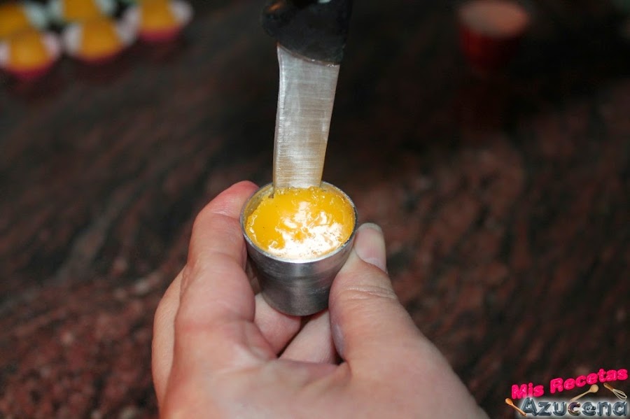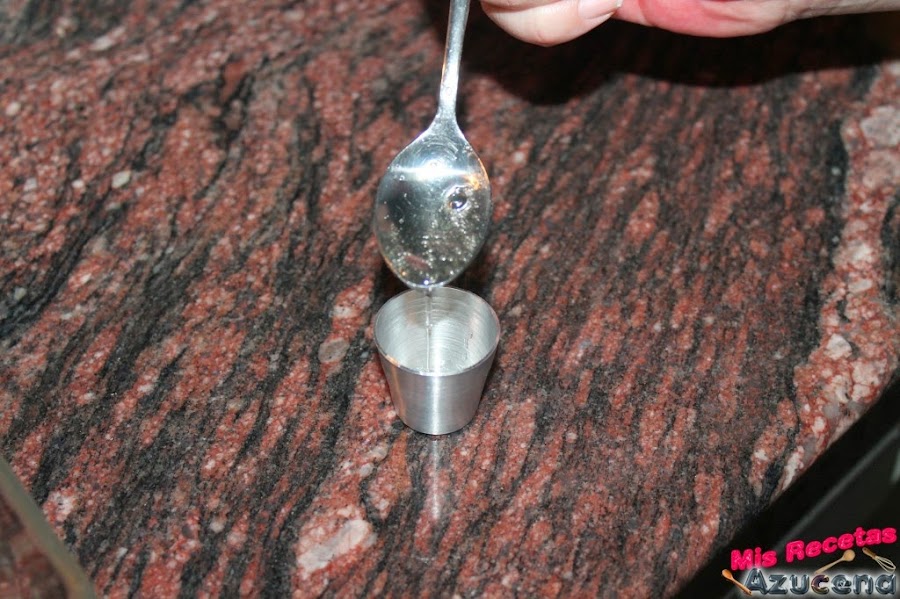 Ya tenemos todo listo para preparar los tocinos de cielo, cogemos nuestros moldes, los que yo utilice son de 3 centimetros y le ponemos un poco del almíbar que tenemos en el cazo a cada molde y a continuación rellenaremos con las yemas.