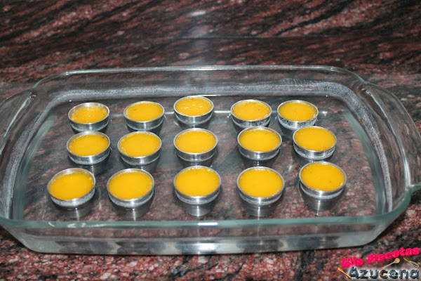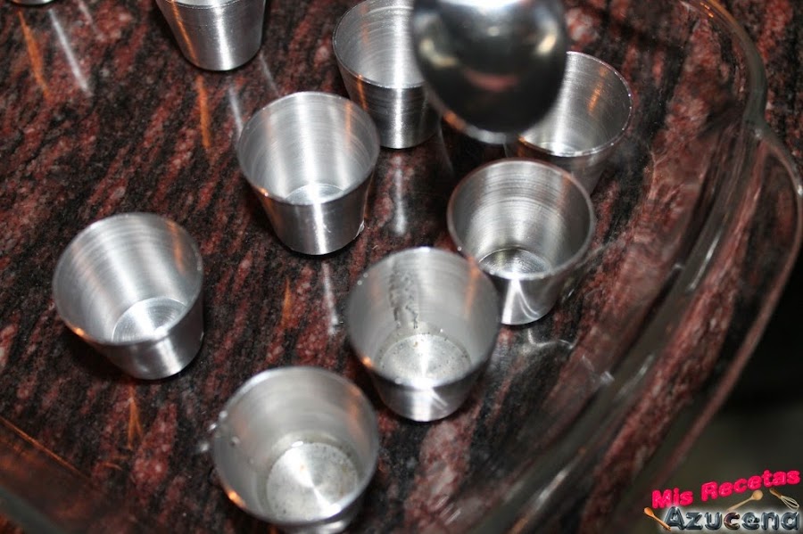 Ponemos todos los moldes en una bandeja apta para horno, una vez tengamos todos los moldes colocados rellenaremos con agua caliente para hacerlos al baño María.