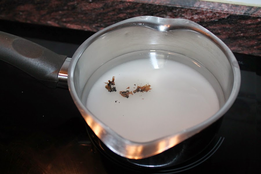 Cogemos la vaina de vainilla la abrimos por la mitad, con ayuda de la punta de un cuchillo le sacaremos las semillas a la vaina y las pondremos en el cazo junto con el azúcar.