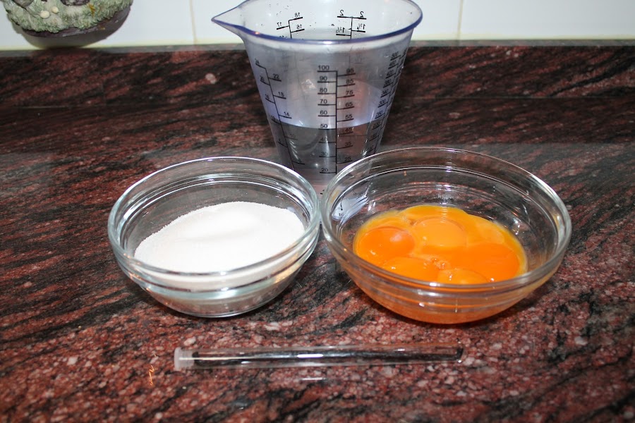Mientras se hace el almíbar cogeremos un bol y pondremos las yemas junto con las dos cucharadas soperas de agua, con ayuda de una varillas iremos batiendo los huevos.