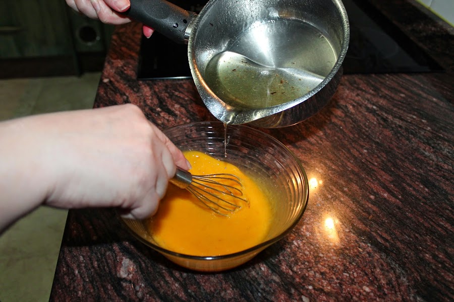 Cuando el almíbar está a punto de hebra retiramos del fuego y ahora empezaremos a batir otra vez las yemas e iremos incorporando el almíbar poco a poco, nos reservaremos un poco en el cazo.