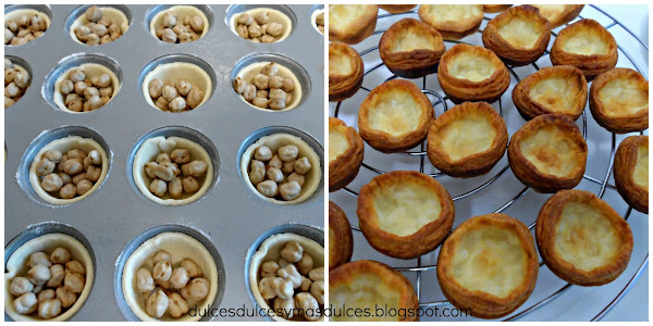Engrasamos ligeramente el molde elegido y colocamos las circunferencias de hojaldre cubriendo las cavidades del molde. En nuestro caso, hemos utilizado un molde metálico de minicupcakes. Como veis en la imagen, cubrimos cada hueco con garbanzos para evitar que la masa suba demasiado durante el horneado.