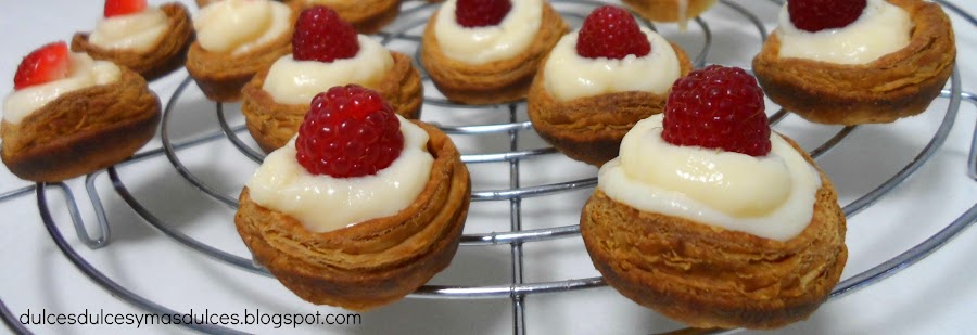 En las bases de hojaldre, añadimos una cucharada de mermelada de frambuesa y encima, añadimos la crema que hemos hecho anteriormente, formando un pico al final.